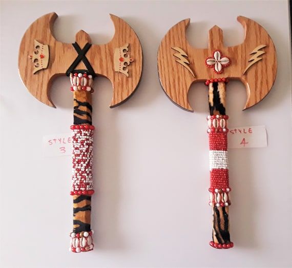 El hacha representa su autoridad, fuerza y dominio, mientras que la espada simboliza justicia, poder y protección espiritual.